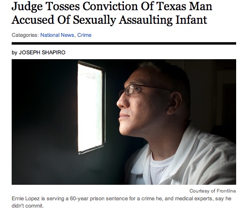 From the NPR site, http://www.npr.org/blogs/thetwo-way/2012/01/26/145901310/judge-tosses-conviction-of-texas-man-accused-of-sexually-assaulting-infant#commentBlock